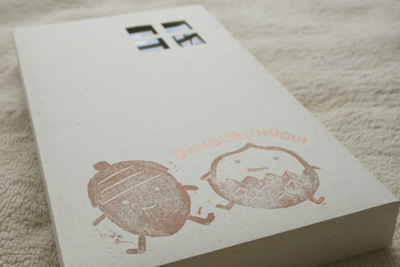 再生紙を使ったオリジナルのギフトボックスをご用意しています。どんぐりすとスタンプを押した箱の小窓から、てぬぐいの模様がチラリ。ギフト包装ご希望のお客様は、「どんぐりストア」の商品のラッピングをご選択ください。