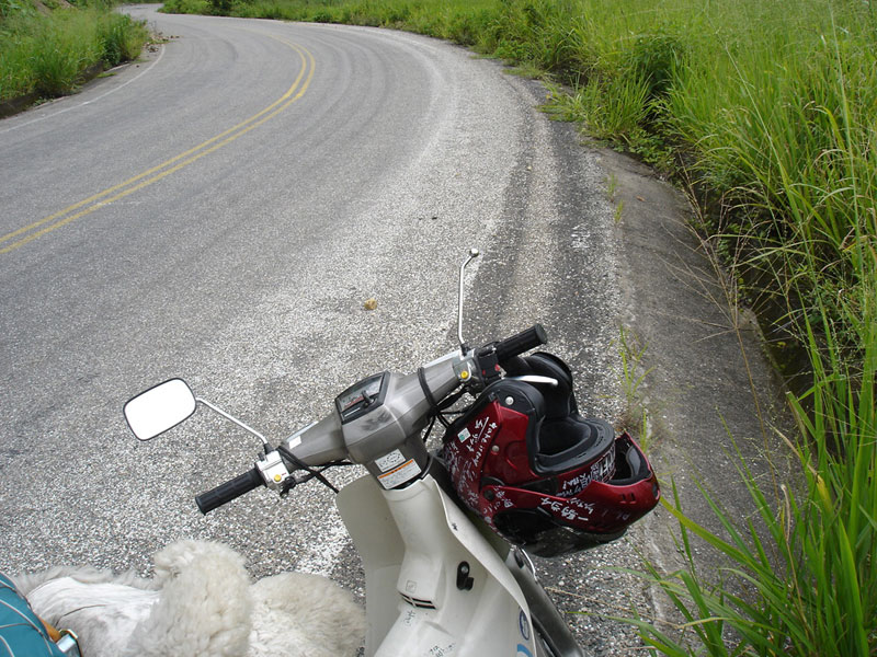 写真を撮ろうと減速しながらカーブの外側によった途端、後輪がズルっと滑った。
