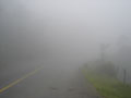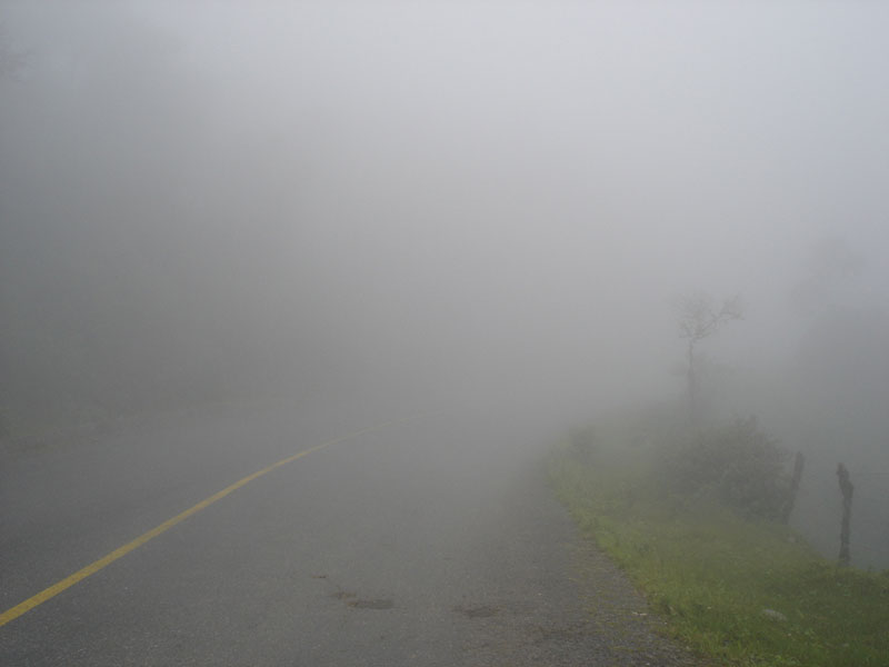 かなり標高が上がってきたようだ。パワーが出ない。そのうちに道は雲の中に入っていく。霧の中、視界が10m位しかない。寒くなってきたのでフリースを着る。次第に雨が降ってきた。更に視界が悪くなる。