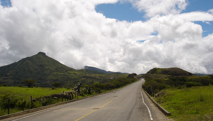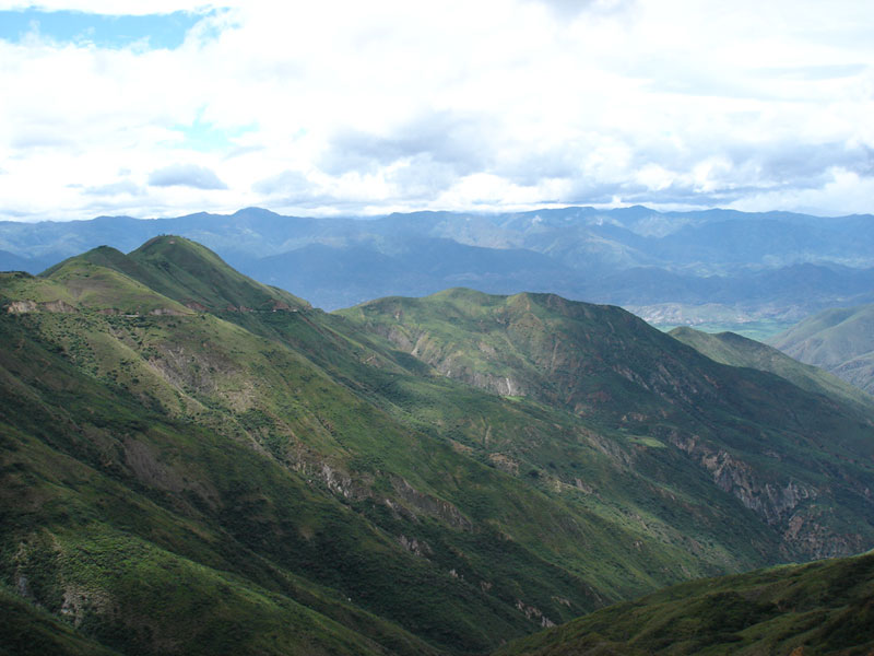 町を出て直ぐに上り坂が始まる。登りは殆ど2速で走る。道には沢山穴があるので慎重に避けながら走る。グングンと高度を上げるとやがて雲の上に出て快晴になった。びしょ濡れになったジャケットも乾き始める。途中、所々舗装が切れて凸凹のダートとなる。道が狭い上、石が多く、直ぐ脇には深い谷があるので、細心の注意を払って慎重に進む。時計を見ると3時間で80キロしか進んでいない。
