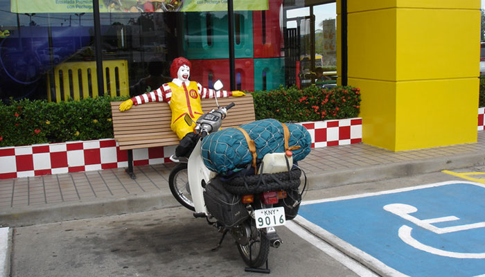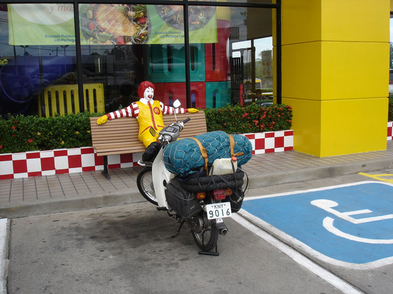 マリオのような髭を生やしたオヤジがニコニコしながら俺のバイクを眺めている。アルゼンチンから走っているというと驚いていた。「この近くに宿はあるか?」聞くと一キロ先に町があって、宿もあると言うので、ゆっくり雨が止むのをまつ。熱帯のスコールだ、それ程長くは降らないだろう。小一時間待つと雨が止んだので、町まで走る。小さい町だが、駐車場のあるデカイホテルがあった。値段を聞くと、22ドルだという。