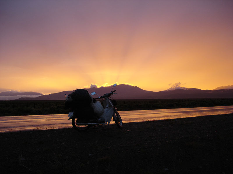夕日が終わり、辺りは急に暗くなる。野宿できそうな場所を探しながら走っていると、ずっと先の山間にオレンジ色の町明かりが見えた。町だ〜〜!!メーターを見ると、あと20キロ位だ。夕日に感動し、一旦は野宿でも構わないと思っていたが、町明かりに誘われるように痛い雨を我慢して、バイザー全開で走る。寒くて震えが止まらない。鼻水も止まらない。嬉しくて涙も出そうだ。真っ暗なところではカブのライトは全く役に立たないが、幸いなことに、前に一台の大型トレーラーが30キロ位のスピードで走っているのでそれについていく。