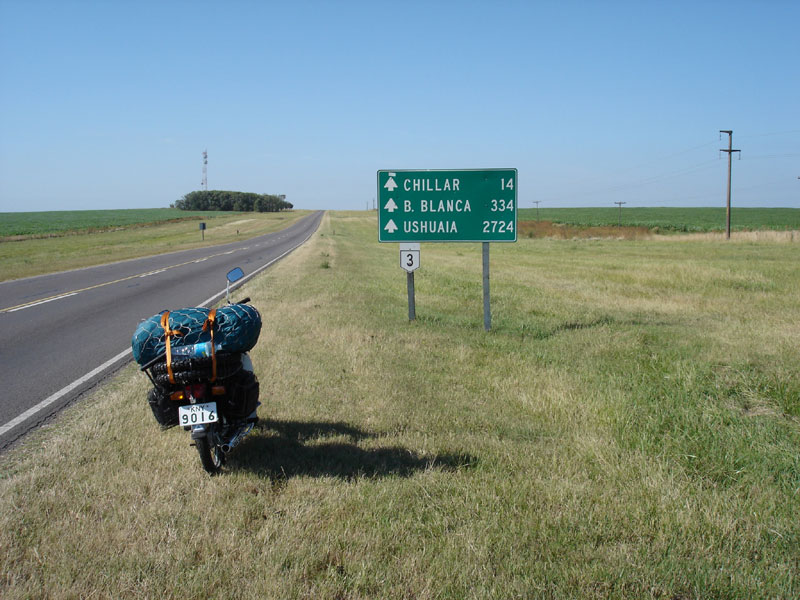 途中ウシュアイアまで2724キロの道標を発見。気が遠くなるような距離だが、気合が入る。午後からはずっと向かい風で極度に疲れる。物凄く暑く、おまけに尻も痛くなり1時間おきに休憩をとるので距離が伸びない。休んでいると通りすがる車がクラクションを鳴らして励ましてくれるのが嬉しい。