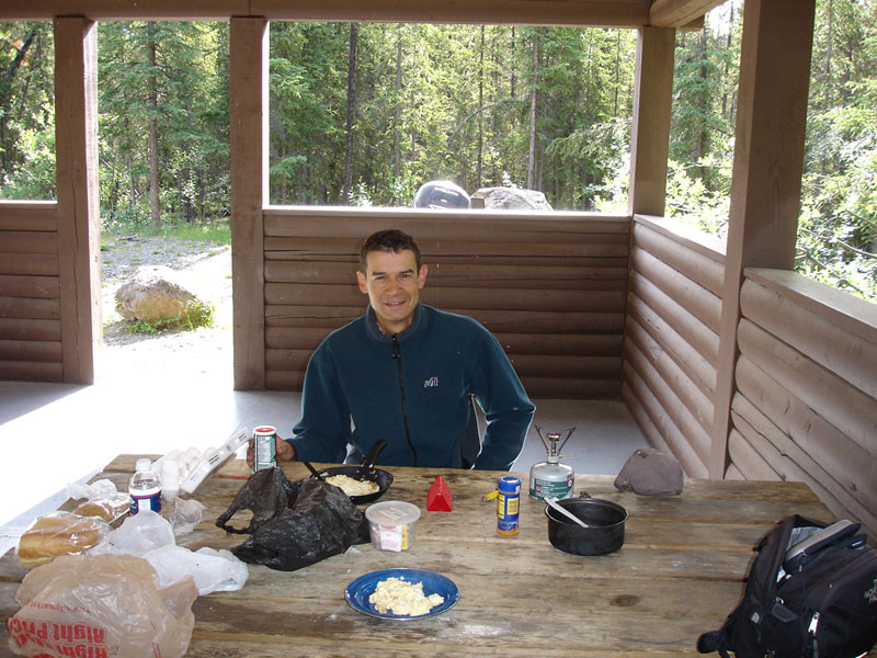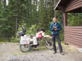 150キロ程走りポリタンからガスを入れようとレストエリアに入ると一台のバイクが止まっていた。フランスから来ているパスカル。聞けば彼もウシュアイアからアラスカを目指しているそうだ。「ココでキャンプしたの?」と聞くとそうだという。ブンブン蚊の飛び交うベンチでスクランブルエッグをご馳走になる。粉チーズを常備しているのがフランス人ぽくて良し。メキシコから殆どキャンプで過しているそうだ。逞しい。ホワイトホースには2つホステルがあるよと教え、先に出る。