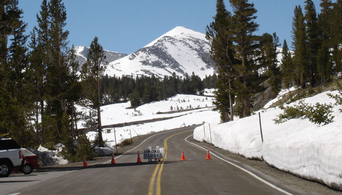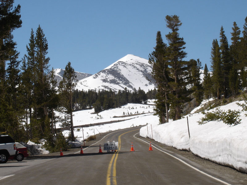 10頃荷物を纏めてヨセミテ公園を目指して坂道を登る。辺りは残雪が残り、スキーやスノーボードを積んだ車が俺を抜いていく。中にはスノーモービルを積んだトレーラーを牽引していくトラックもある。グングン高度を上げると道が封鎖されている。くぅ〜、まだオープンしてねーのか!