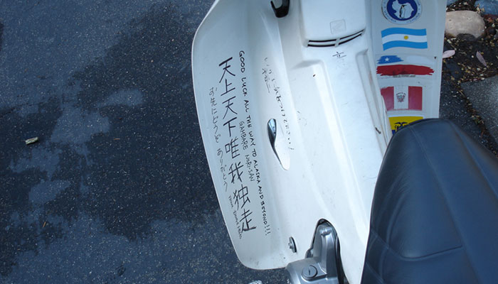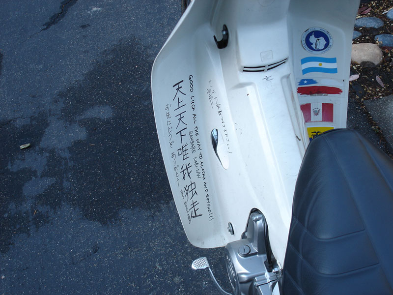 デーロ!I-5に乗り、追い風に背中を押されるようにガンガン走る。途中のサービスエリアで頂いたバナナを食っていると、一人のオッサンが話し掛けてきた。「こいつで旅してんのかい?いやー凄いねー!何、アルゼンチンから?ひゃ〜!」と驚いている。壊れたりしてないかい?と聞くので今日マフラーが割れているのを見つけたと言うと、ポートランドで友達が溶接工場をしているので良かったら行ってごらんと住所を貰う。有り難いが、残念ながらポートランドに行く予定は無い。サンドイッチをご馳走になる。おまけにオレゴンとワシントンの地図まで貰う。今日は人から貰ったモンばっかり食ってるなぁ。