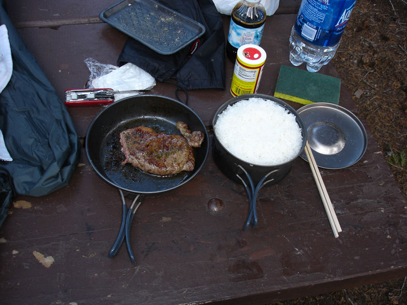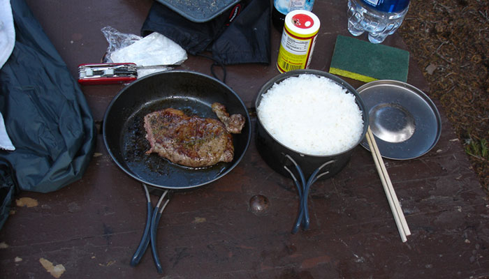 テントを張っているとデカイ蚊の大群に襲われる。いざ虫除け!っと思ったが、虫除けも洗面道具と一緒にモモさん家に吊るされている。仕方ないのでキャンプ場の店でスプレーを買う。頭からシューっと一噴きしてテントの入口にも一噴きする。蚊が近づいてこないので安心して再び薪拾いから始める。今日は良い薪が無いが、調理だけなら小枝で十分。「ステーキ&ライス」の豪勢な夕飯を堪能する。肉を食えば寒さなんてヘッチャラだい!