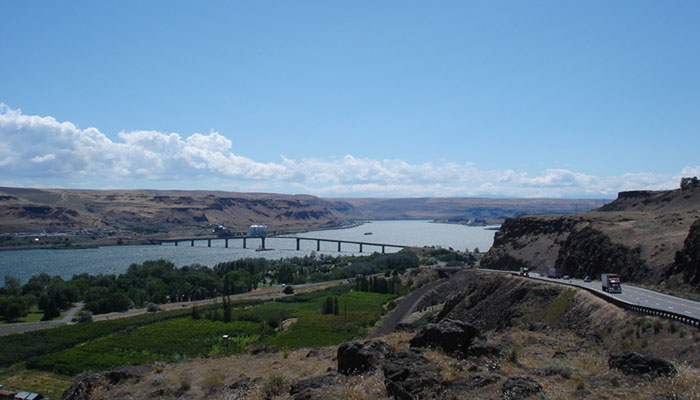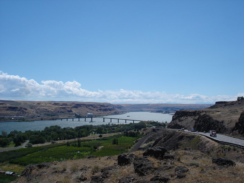 気合で谷道を走っていると目の前に大きな川が流れている。オレゴン州とワシントン州を隔てる州境だ。強烈な風が吹き荒れる中、ガソリンを入れてながら店のアンちゃんにいつもこんなに風が強いのか?と聞いてみると「この辺は毎日さ」とあっさり言う。まさに風の谷だ。長い橋を渡ると山道になってきた。