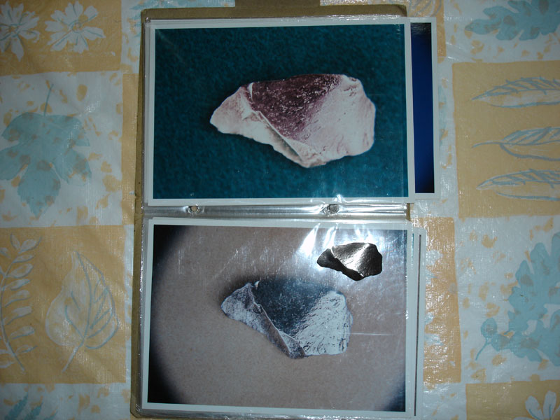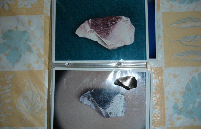 金属片を見せてもらう。驚くことに、金属の破片は下に敷く物の色に反応し、色を変えるという。ぶっとんだ!本当に色が変わるのだ!UFOは本当に地球に来ているのか!地球ピンチ!中々興奮が冷めないでいると田部さんが破片の写真をくれた。色々な写真があったが、全て色が違う。これはスタジオで同一条件のもと、下に敷く物の色だけ変えたものだという。自分で写真を撮らせてくれとお願いすると「この金属はカメラのパワーを吸い取ってしまうぞ」というので半信半疑数枚の写真を撮ると驚くことにみるみるバッテリーが減っていくではないか!信じられん!