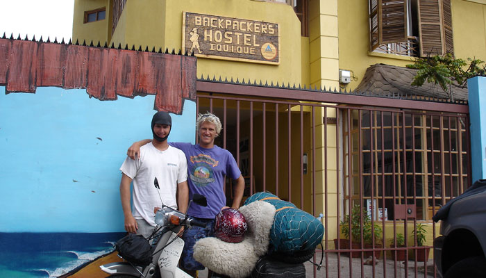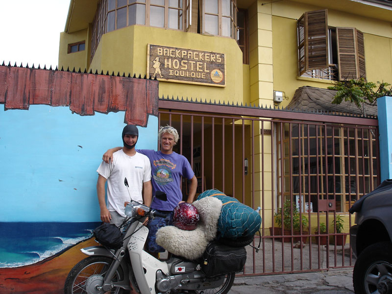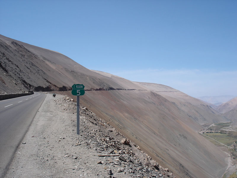 今日の行程はペルー国境の町アリカまでの約300キロ。世界で最も乾燥している砂漠地帯。一時間も走ればすっかり乾くに違いない。カルフォルニアから来ているサーファー二人が起きて来て見送ってくれるので、記念撮影をして出発。ビーニャで合った藤原さんの話しではイキケ-アリカ間には3つの大きな峠があるという。途中GSも無さそうなのでポリタンも満タンにして、まずは5号線に戻るまで約1000m登る。