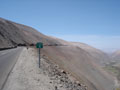 5号線に辿り着くも今日は暑い!フリースを脱いで再び出発。峠を登ると言うよりは谷を下ると言うほうが正しいと思う。一直線に伸びる砂漠の道は、やがて海まで伸びる川が作り出した巨大な谷を下る。谷間には物凄い風が吹く。右手は谷底までは急な砂の傾斜になっていて、落ちたら多分上がって来られない。左も同様な斜面が延々と続き、再び落石と転落に注意。しかし、日本にもある落石注意の看板。落石は注意のしようが無いと常々思う。