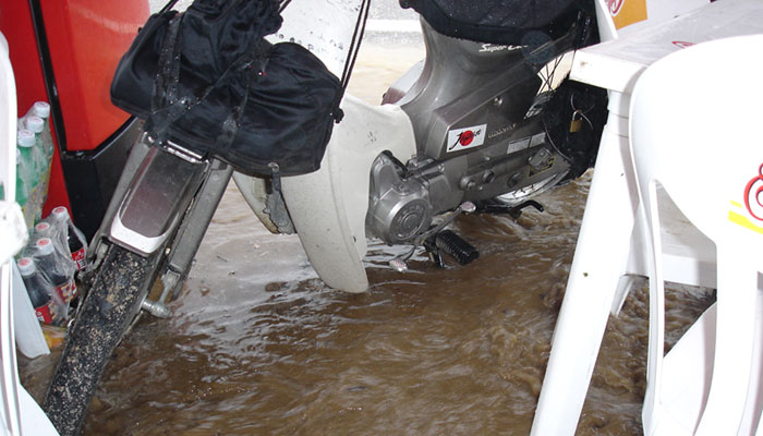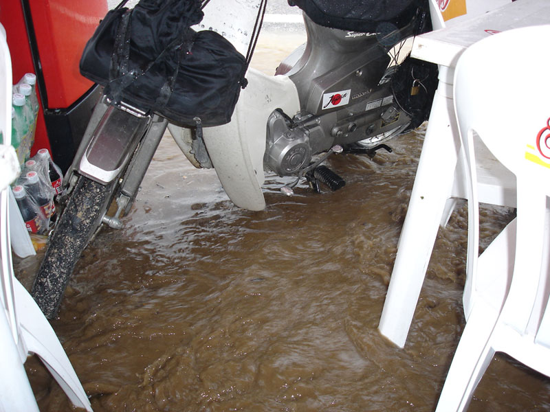 暫く走るとドンヨリとした雲が出てきた。小さな村に入り、雨に備えてジャケットを着る。荷物を積み直した途端にザァーっと降出したので道端の屋台に逃げ込む。タコスを食いながら暫く待っていたがドンドン激しく降ってくる。道路よりも一段下がった所に店を出している屋台に次第に水が流れ込み始め、あれよあれよと言う間に川になってしまった。椅子に足を乗せたまま身動きが取れなくなってしまった。店のおばちゃんはドンブラコと流れていくジュースを追っかけるのに必死だ。コルデーロ号がが水没しそうだ。水深が10センチ近くになってきたので意を決して脱出する。
