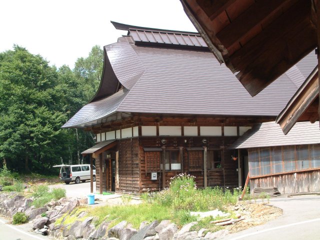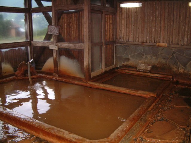 秋山郷に点在する温泉のひとつ。写真でわかるように赤い湯である。一般の療養泉の基準の倍以上の高濃度温泉で療養効果が高いといわれる。もともとは無色透明だが空気に触れると参加して赤褐色になり、いかにも効果がありそうな感じがする。なめてみたらかなり塩辛かった。急勾配の屋根を持つ山小屋風の建物。売店・食堂・休憩室がある。