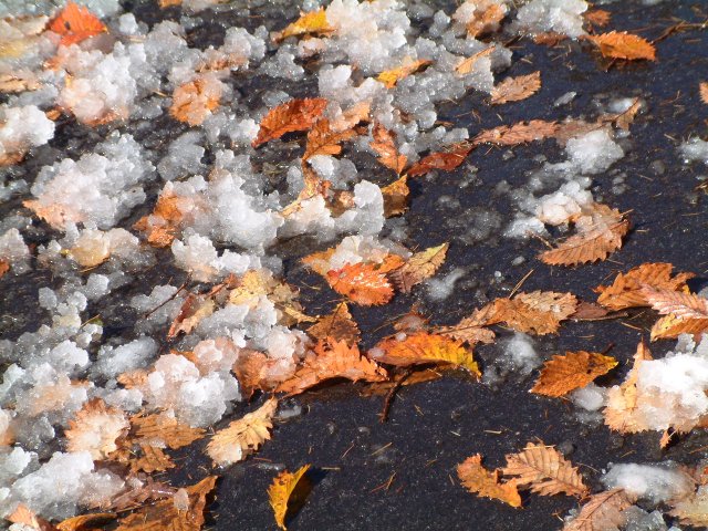 初雪を降らせた冷たく強い風が去った後、シャーベットと化した氷に落葉樹の枯葉が折り重なっていた。
